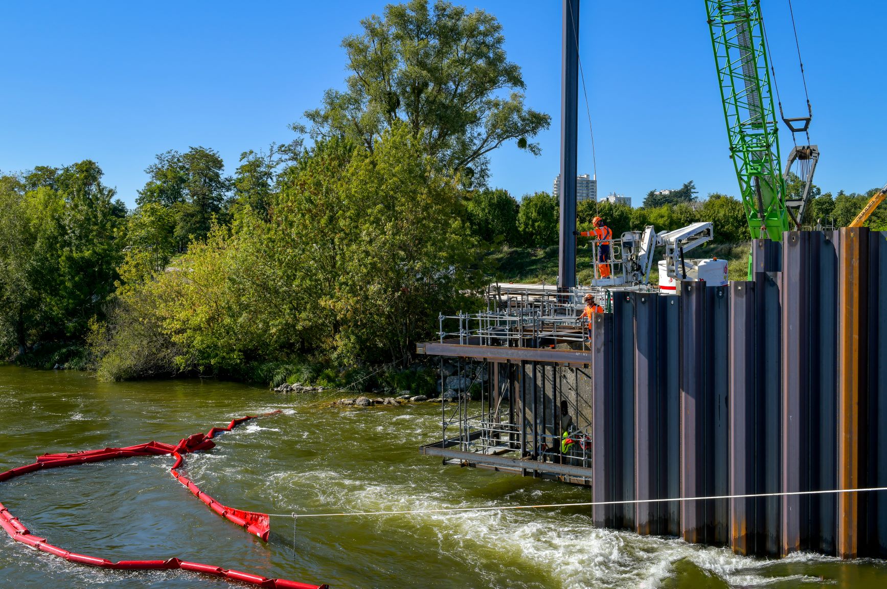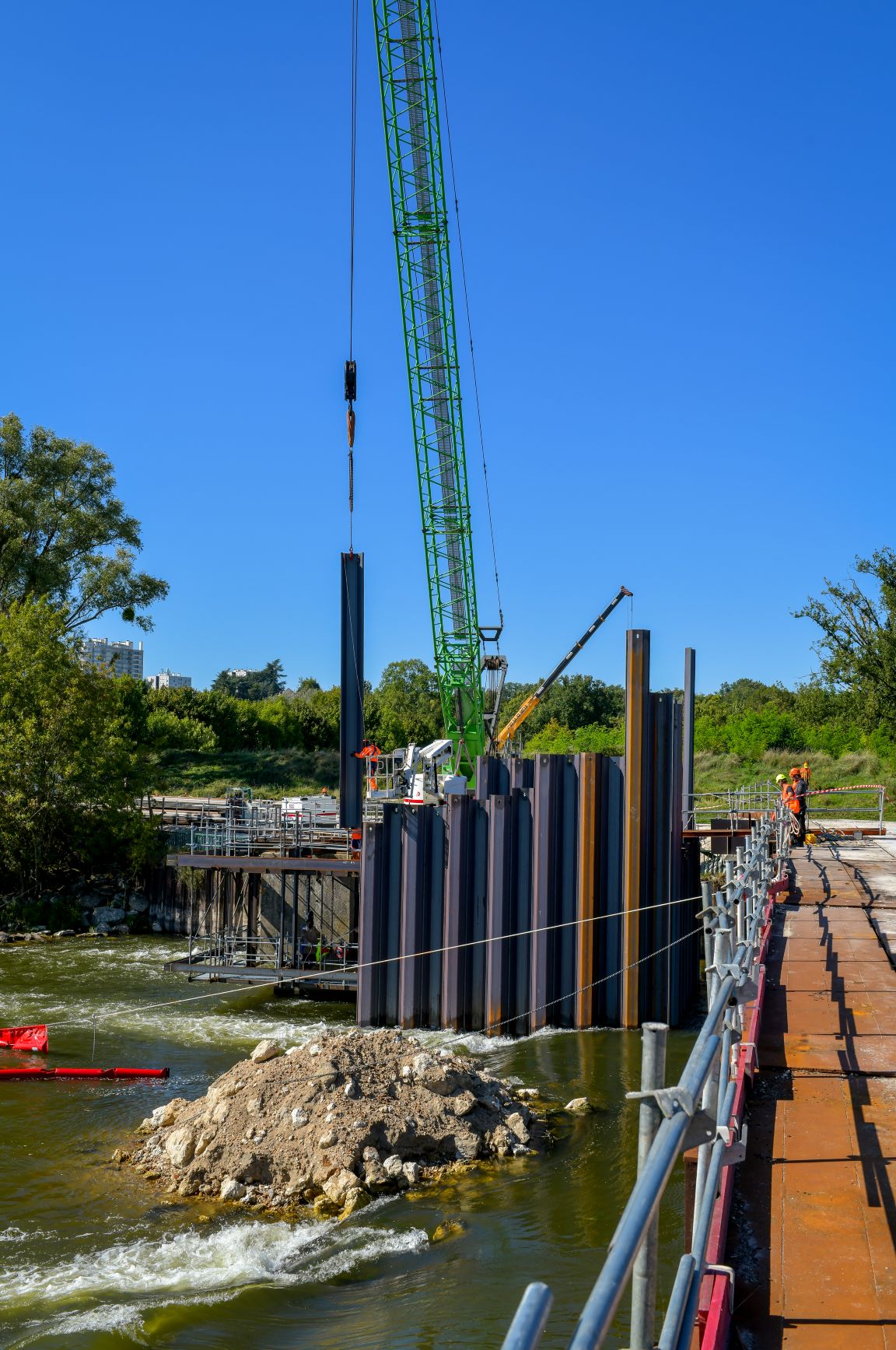Septembre 2025 – L’estacade permet d’accéder aux piles de l’ancien barrage pour les réparer. © CD41/X.Leone -