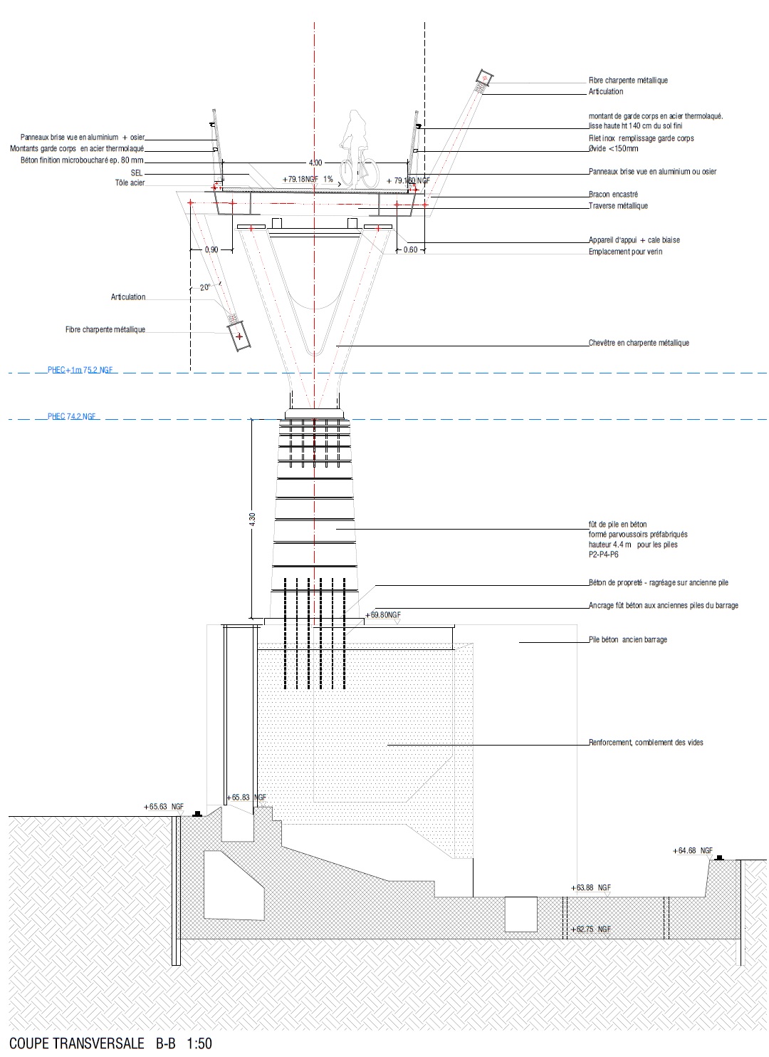 Les piles seront donc rehaussées par des fût en béton de 3,7 à 4,3 mètres de hauteur qui seront surmontés de piles en acier de 3,6 mètres en forme de Y.